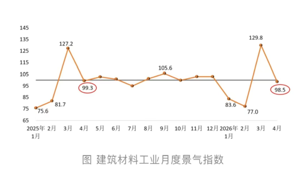 2026年4月份建筑材料工业景气指数为98.5点,低于临界点,处于非景气区间,比上年回落0.8个百分点,回落幅度大于上年同期。