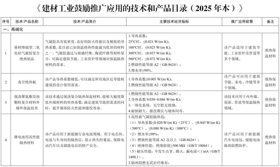 真空绝热板、气凝胶复合绝热制品等列入《建材工业鼓励推广应用的技术和产品目录(2025年本)》